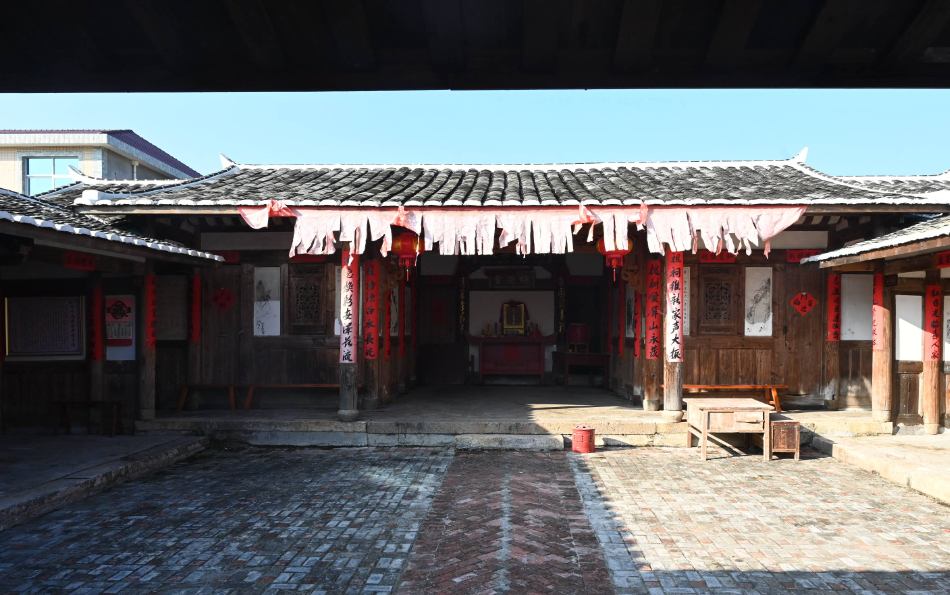由围墙、半月池、前坪、下堂、天井、正堂、后楼和左右厢房、护厝组成的合式院落